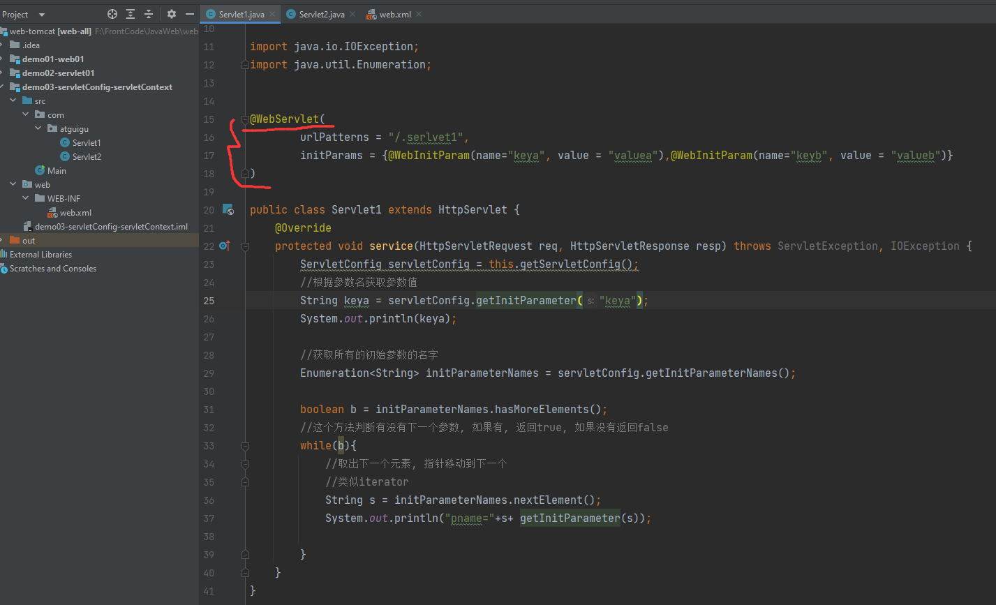 @WebFilter( filterName = "loggingFilter", //定义初始参数的 initParams = {@WebInitParam(name="dateTimePattern",value="yyyy-MM-dd HH:mm:ss")}, //通过路径, 后缀名 过滤 urlPatterns = {"/servletA","*.html"}, //通过servlet别名 过滤 servletNames = {"servletBName"} ) public class LoggingFilter implements Filter { private SimpleDateFormat dateFormat ; /*init初始化方法,通过filterConfig获取初始化参数 * init方法中,可以用于定义一些其他初始化功能代码 * */ @Override public void init(FilterConfig filterConfig) throws ServletException { // 获取初始参数 String dateTimePattern = filterConfig.getInitParameter("dateTimePattern"); // 初始化成员变量 dateFormat=new SimpleDateFormat(dateTimePattern); } @Override public void doFilter(ServletRequest servletRequest, ServletResponse servletResponse, FilterChain filterChain) throws IOException, ServletException { // 参数父转子 HttpServletRequest request =(HttpServletRequest) servletRequest; HttpServletResponse response =(HttpServletResponse) servletResponse; // 拼接日志文本 String requestURI = request.getRequestURI(); String time = dateFormat.format(new Date()); String beforeLogging =requestURI+"在"+time+"被请求了"; // 打印日志 System.out.println(beforeLogging); // 获取系统时间 long t1 = System.currentTimeMillis(); // 放行请求 filterChain.doFilter(request,response); // 获取系统时间 long t2 = System.currentTimeMillis(); String afterLogging =requestURI+"在"+time+"的请求耗时:"+(t2-t1)+"毫秒"; // 打印日志 System.out.println(afterLogging); } }