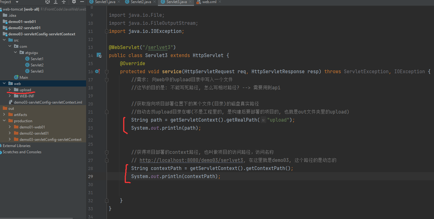 @WebServlet("/servletB") public class ServletB extends HttpServlet { @Override protected void service(HttpServletRequest req, HttpServletResponse resp) throws ServletException, IOException { // 从请求域中获取数据 String reqMessage =(String)req.getAttribute("request"); //返回的是object, 自己转成String System.out.println(reqMessage); // 从会话域中获取数据 HttpSession session = req.getSession(); String sessionMessage =(String)session.getAttribute("session"); System.out.println(sessionMessage); // 从应用域中获取数据 ServletContext application = getServletContext(); String applicationMessage =(String)application.getAttribute("application"); System.out.println(applicationMessage); } }